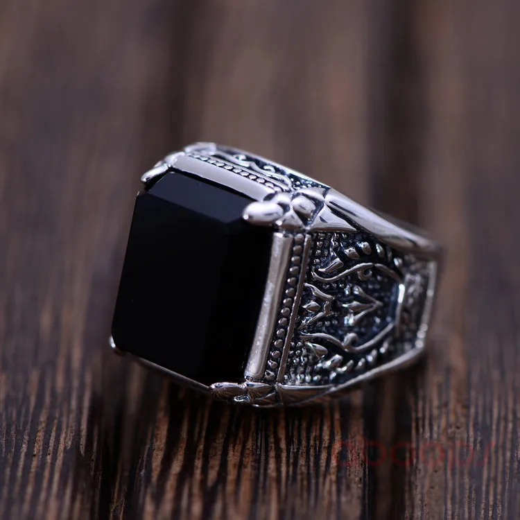 Hot Sale Vintage Black 925 Sterling Silver Rectangle Natural Onyx Stone Ring Engraved Fire for Men Boys Size