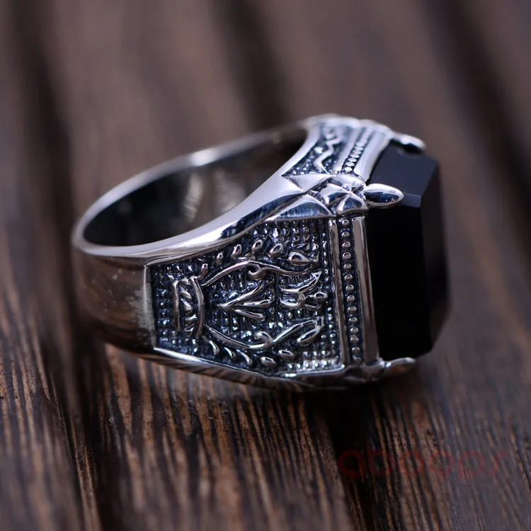 HIGH QUALITY Vintage Black 925 Sterling Silver Rectangle Natural Onyx Stone Ring Engraved Fire for Men Boys Size